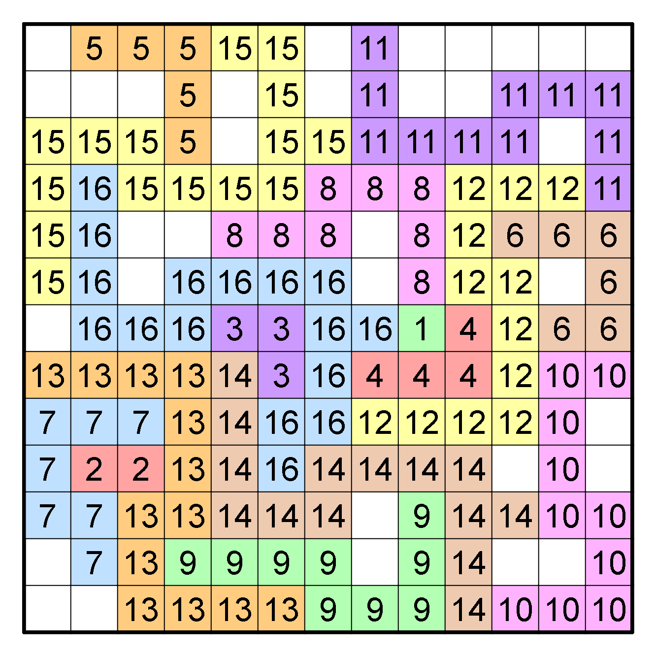 The unique values of a, b, and c that allow all the clued entries to resolve to a positive integer between 1 and 17 are a = 1/4, b = -3, and c = 1/2. The completed grid is shown above; the product of the smallest and largest sums is 56 × 162 = 9072.